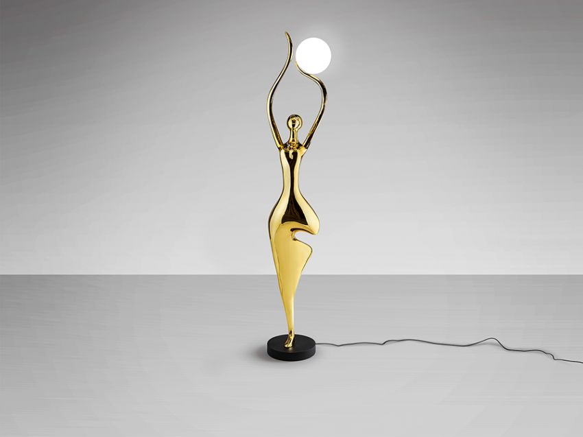 Wykończenie: Figurka wykonana z włókna szklanego i żywicy poliestrowej, wykończona jasnym złotem, na matowej, czarnej metalowej podstawie.
